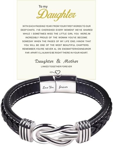 To My Daughter Love You Forever Bracelet, Mother and Daughter Forever Linked Together Braided Leather Bracelet, Stainless Steel Infinity Knot Engraved Inspirational Bangle Gift from Mom
