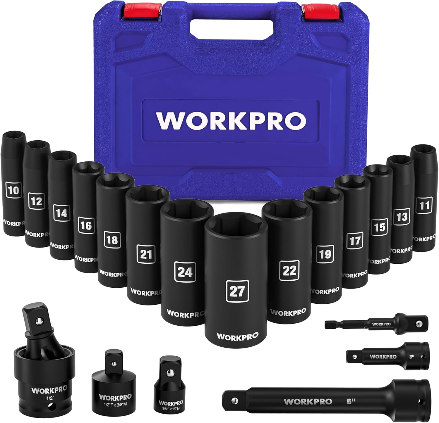 WORKPRO 20-Piece 1/2" Drive Deep Impact Socket Set, 6-Point, Cr-V Steel, 10-27mm, Universal Joint, Adapter and Extension Bar, Metric