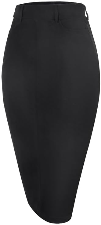 Houmous Women's Cotton Work Pencil Skirt Stretch Office Midi Below Knee Bodycon Belt Loops Back Slit Pockets
