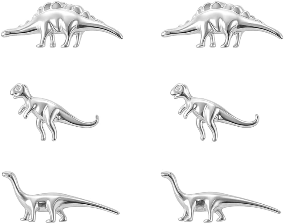 Silver Dinosaur Stud Earrings Set – 3 Pairs Cute Stegosaurus, T-Rex & Long Neck Dino – Hypoallergenic Animal Earrings for Women & Dino Lovers - Great Gift!
