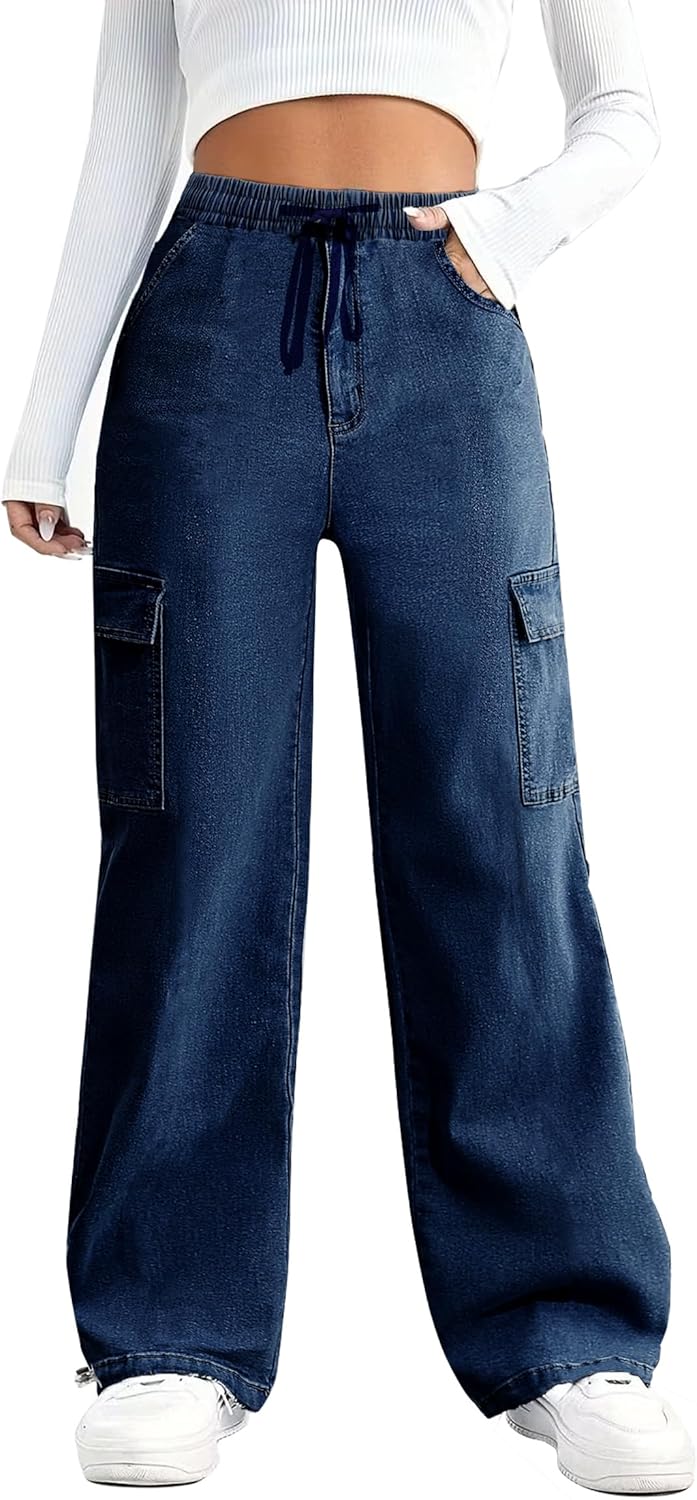 SESERAGI Straight Wide Leg Cargo Jeans Baggy Stretchy Elastic Waist Drawstring Casual Trousers Denim Pants Streetwear