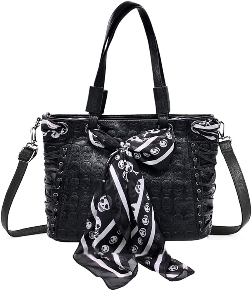 Downupdown Women Handbags Purse Shoulder Bags Skull Print Leather Hobo Bag Black Gothic Bag Ladies Satchel with Handkerchief
