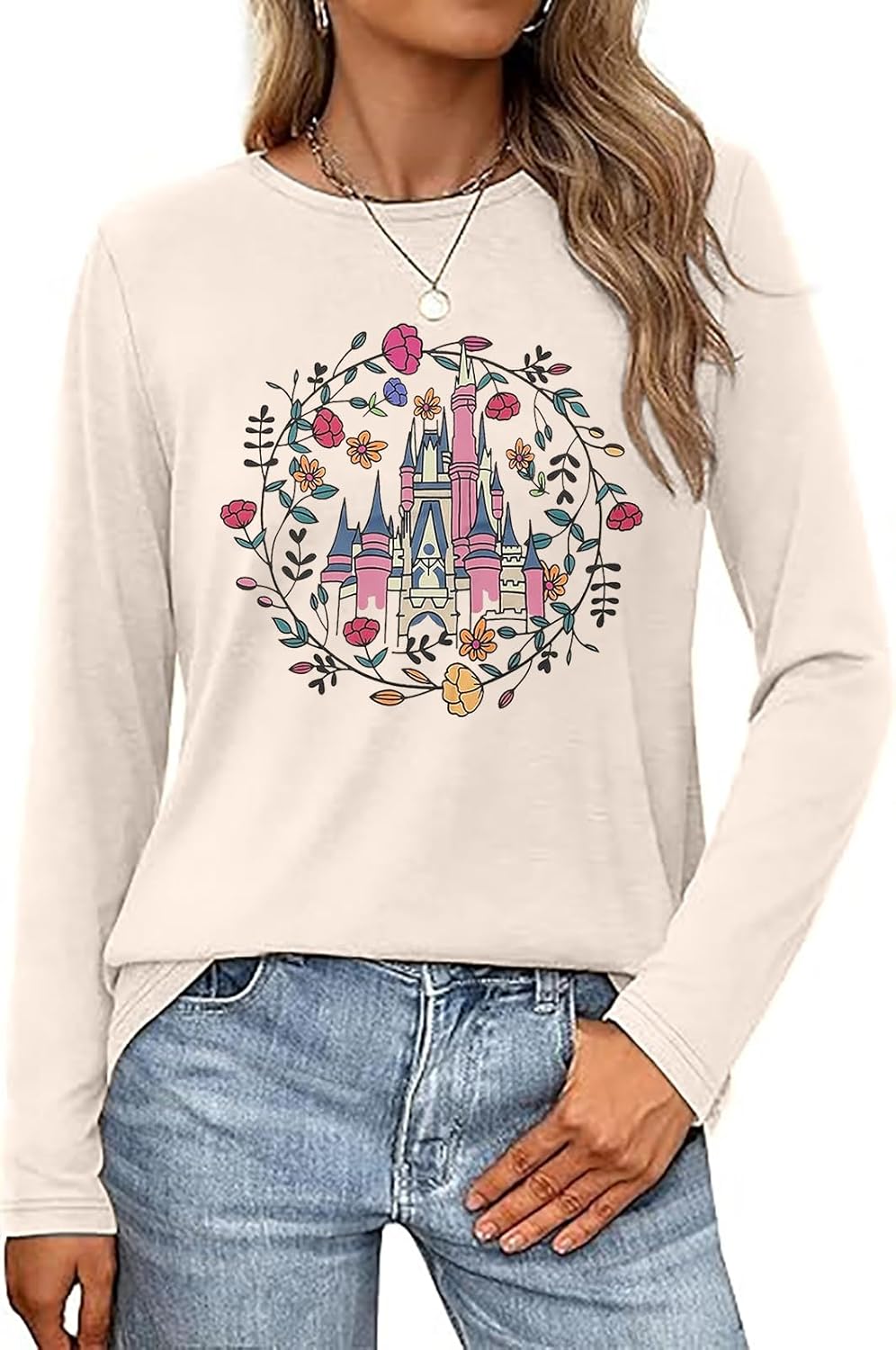 Magical Kingdom Castle Shirts Women Magic Long Sleeve Flower Graphic Holiday Tops