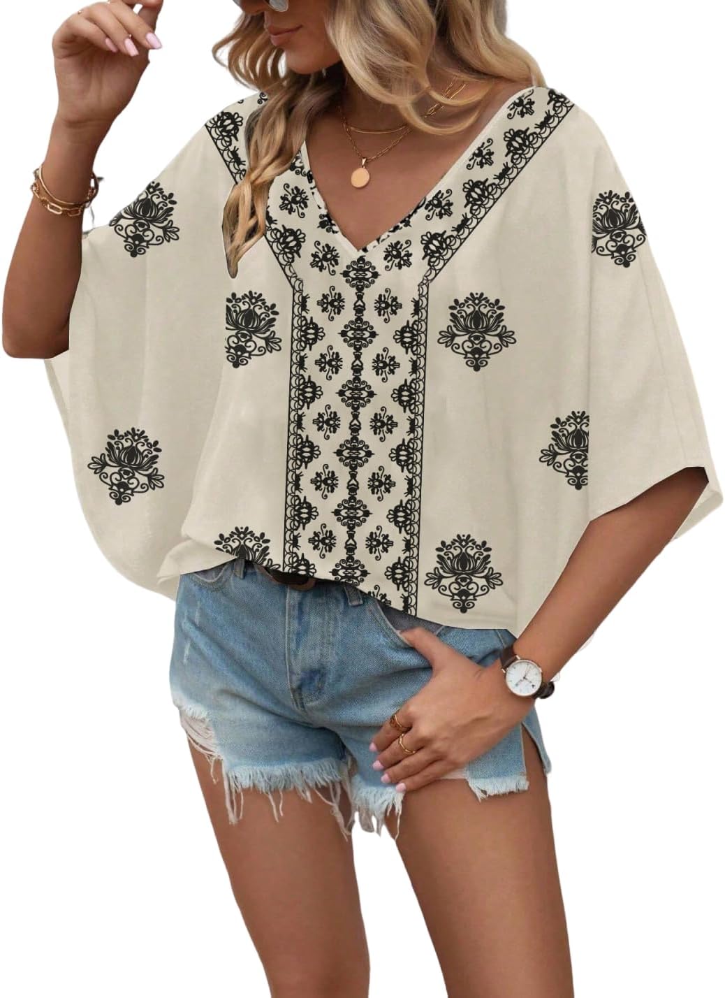 Urchics Chiffon Batwing Tops for Women Short Sleeve V Neck Blouse Tops V-Neck Casual Loose Summer Top Shirts