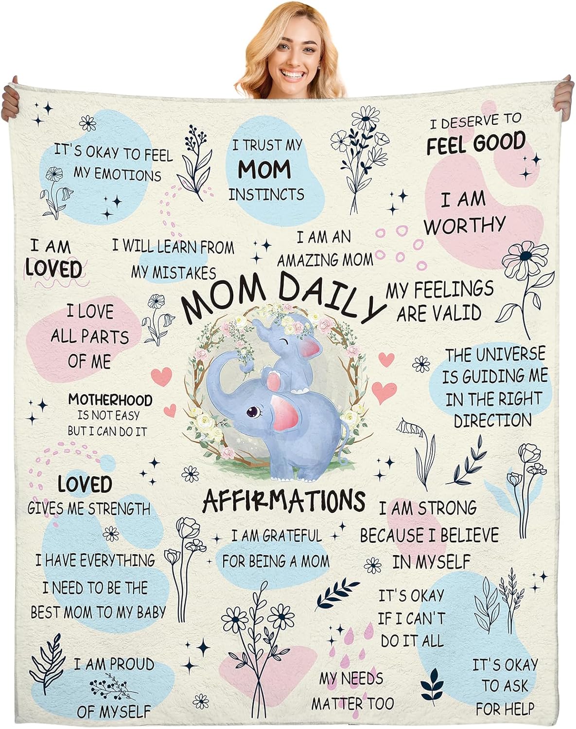 - Daily Affirmations for Positivity: Featuring heartwarming messages like “I am strong,” “I am loved,” and “It’s okay to ask for help,” this blanket uplifts every mom’s spirit. The cute elephant design symbolizes love, strength, and motherhood connection