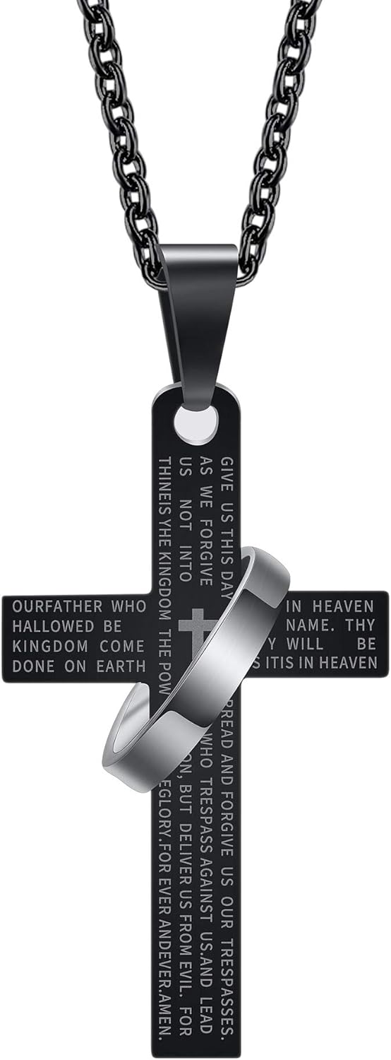 Lord's Prayer Engraved Cross Pendant Necklace with Ring Stainless Steel Religious Jewelry for Men and Women, Faith-Inspired Gift