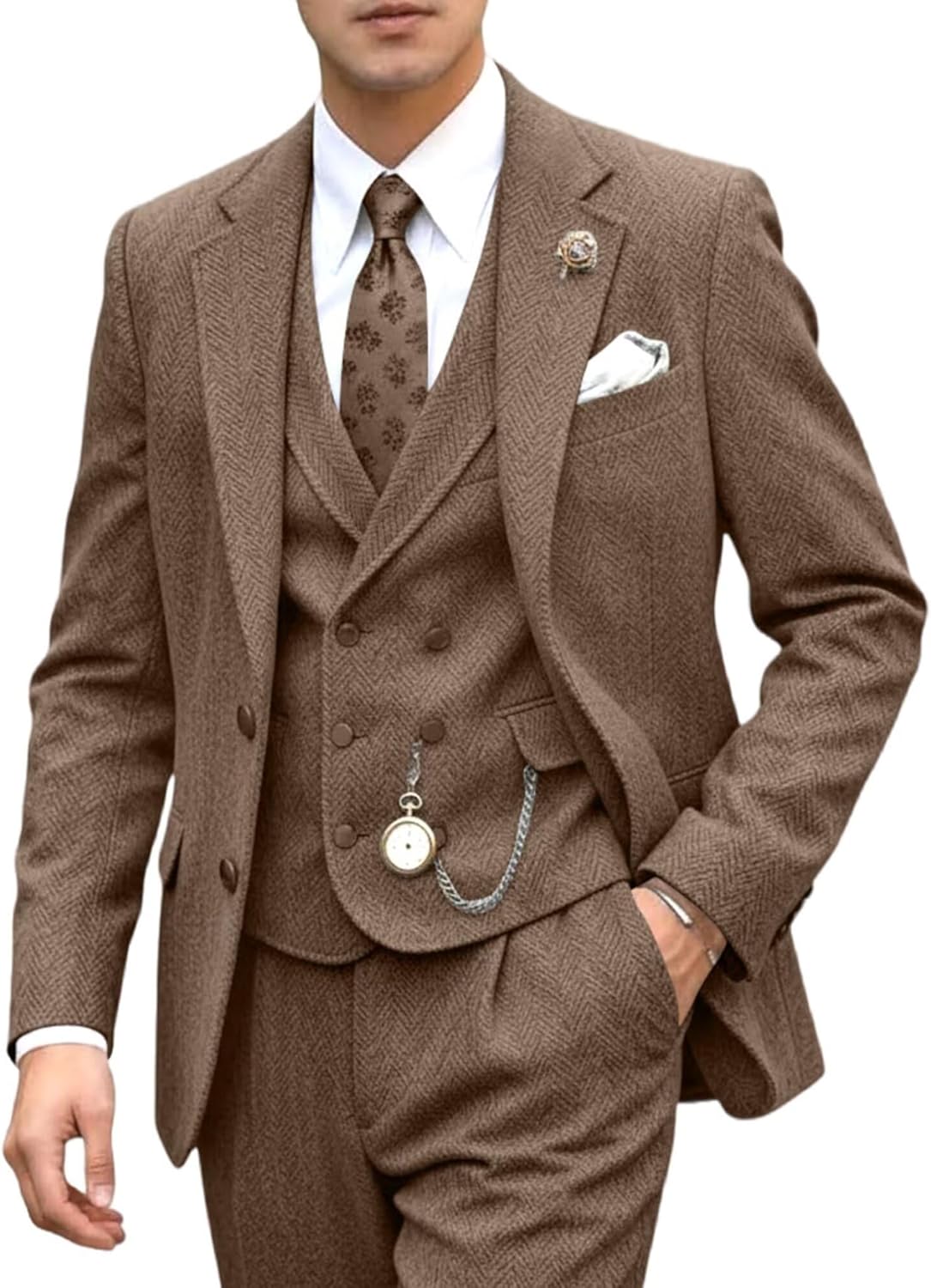 Tweed Mens Suit 3 Piece Slim Fit Herringbone Suit for Men Wool Blend Blazer Double Breasted Vest Pants Tuxedo Set