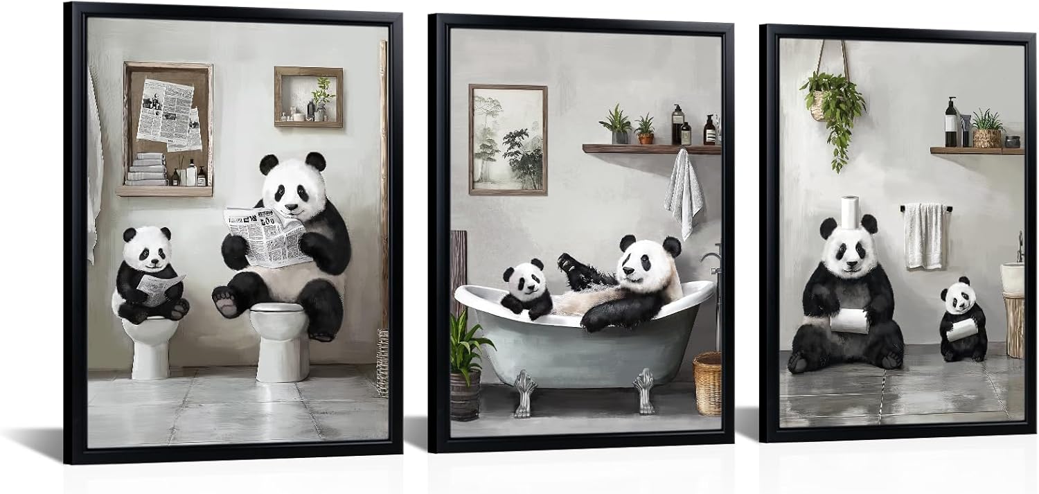 - BATHROOM DECOR SET: Three-piece 12''x16'' black framed wall art collection featuring whimsical panda bears in various bathroom scenes, perfect for adding humor to your space