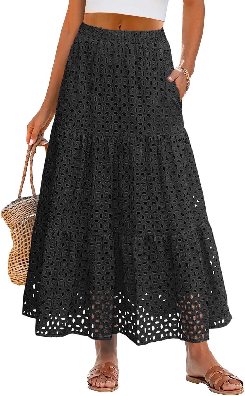 ANRABESS Maxi Skirts for Women Boho Tiered Eyelet Elastic High Waist A-Line Summer Casual Flowy Beach Vacation Long Skirt