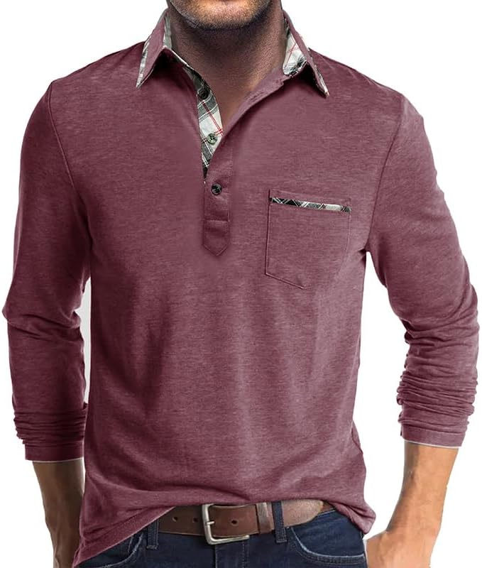 Mens Long Sleeve Polo Shirts Casual Button Moisture Cotton Tees Stylish Tops Golf Shirts with Pocket