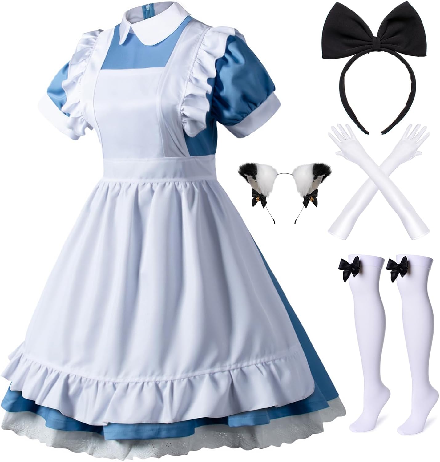 - Lolita maid costume package includes: Dress *1 , Fancy apron*1 , kawaii bow-knot headwear *1 ,Bow-knot lolita over the knee high socks *1pair , Satin smooth gloves *1, 5-piece set.