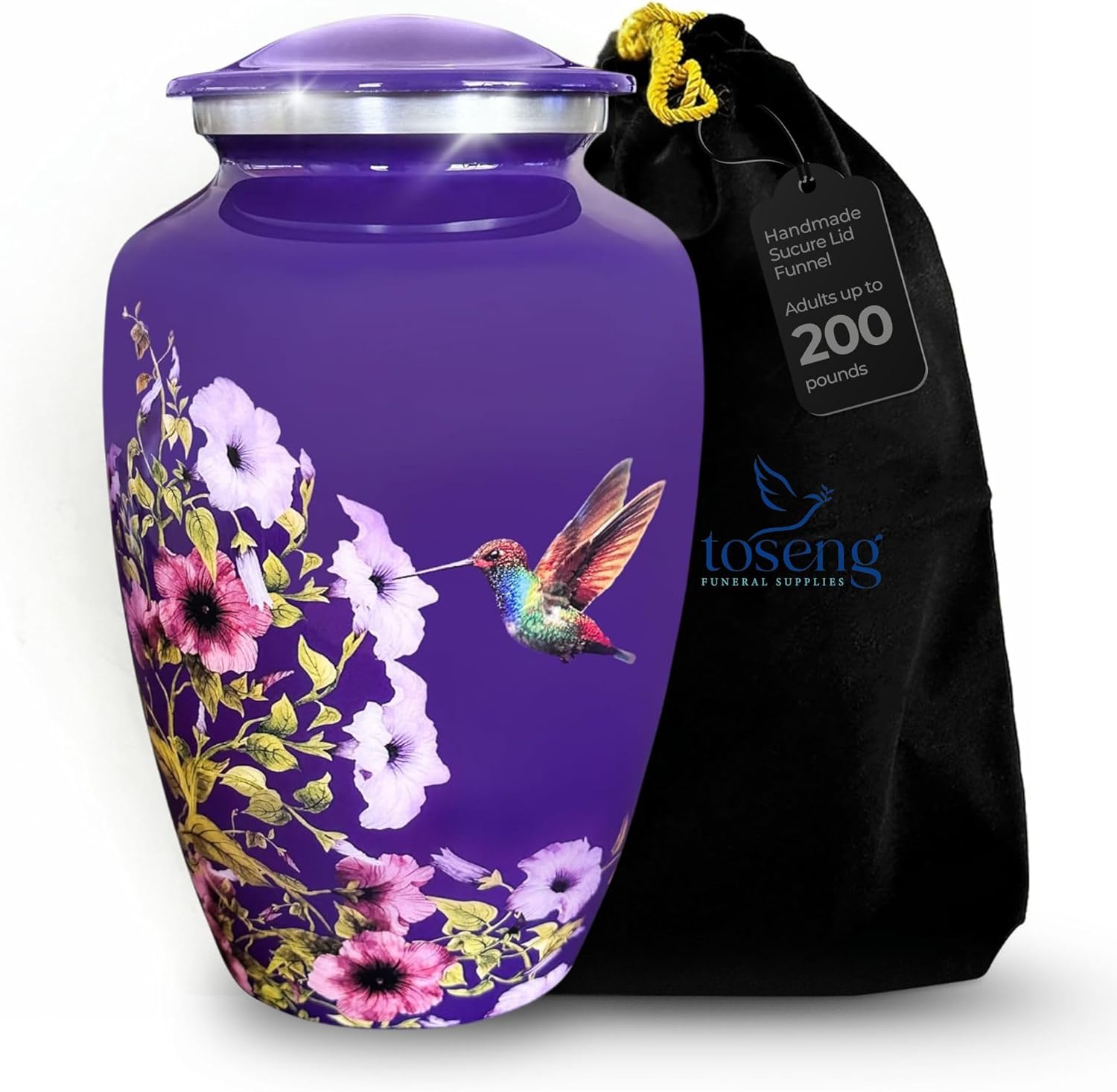 Purple Hummingbird Urn for Human Ashes - Large Cremation Urns for Adult Ashes - Polished Aluminum Funeral Burial Memorial with Velvet Bag, 200lb Capacity