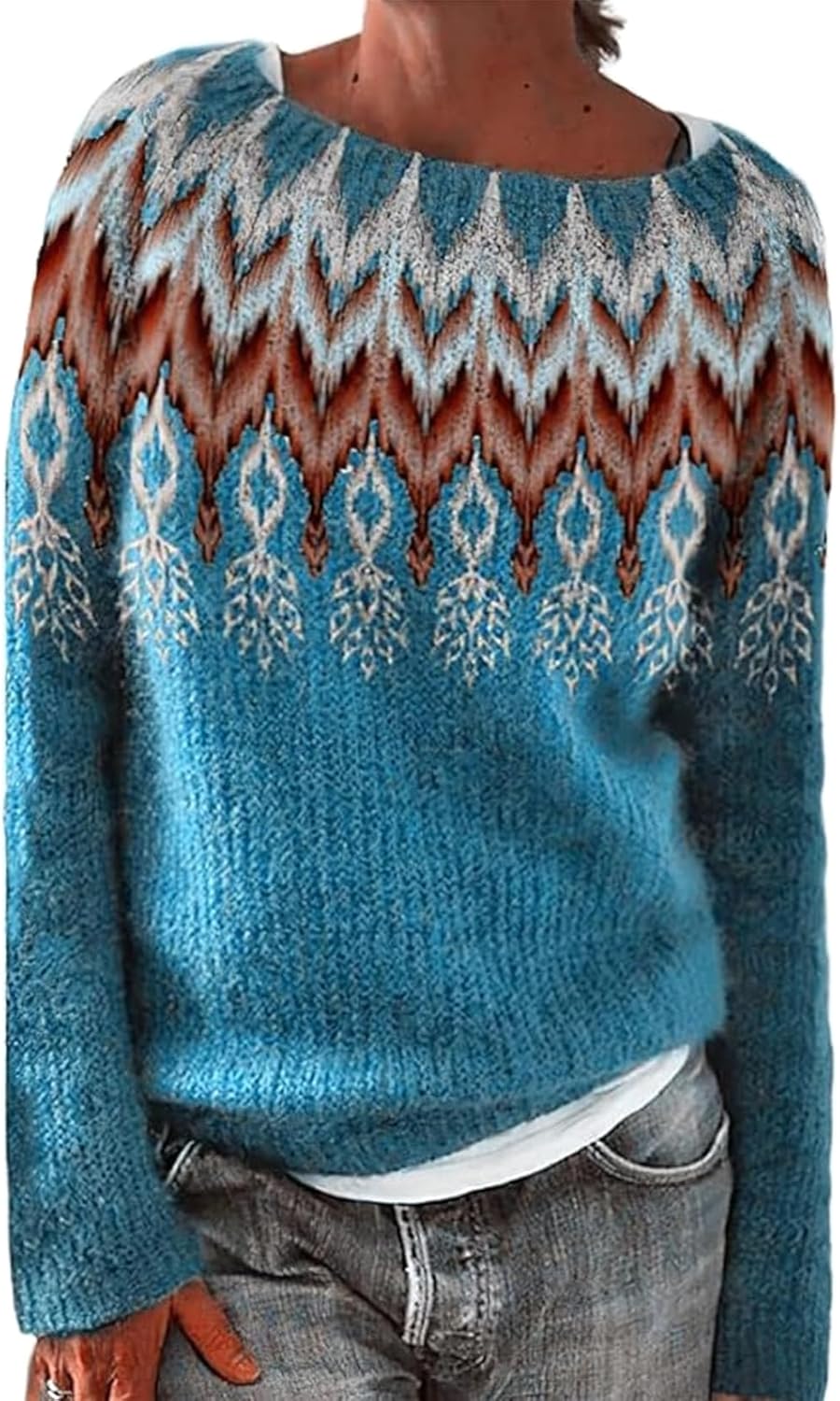 Fair Isle Sweater for Womens Winter Long Sleeve Vintage Knitted Sweater Casual Fall Crew Neck Pullover Sweaters