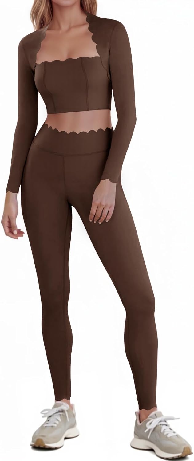 Fisoew Two Piece Workout Sets For Women High Waisted Scolloped Leggings with Crop Tops Gym Yoga Active Wear Outfits