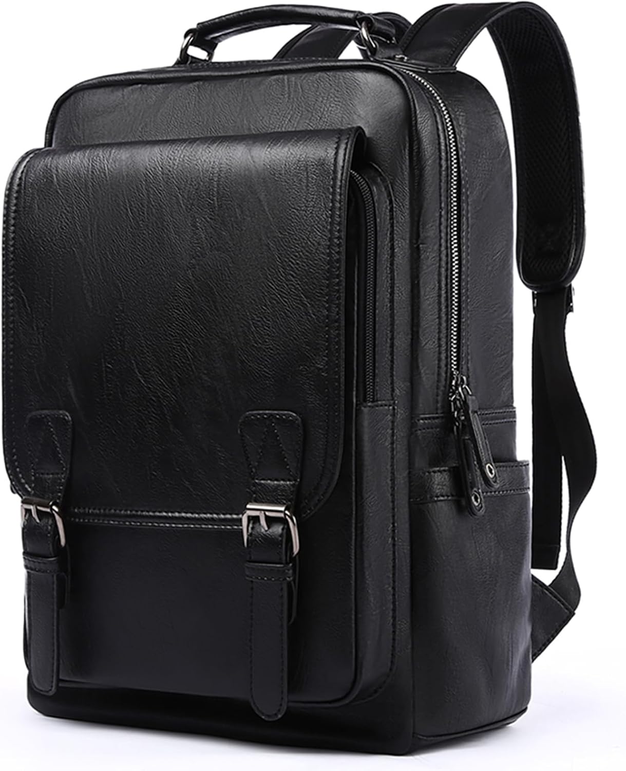 - SIZE: This mens black PU leather backpack measures 11.4" * 5.5" * 16.5" (29cm * 14cm * 42cm) with a 17-liter capacity, perfect for daily commuting, work, travel, and college use. The main compartment offers ample space, featuring a dedicated laptop sleeve (fits up to 15.6-inch laptops), two inner pockets, one front zippered pocket, and two side pockets. Whether you need to carry office supplies, books, or travel essentials, this high-capacity backpack keeps everything organized and within reach