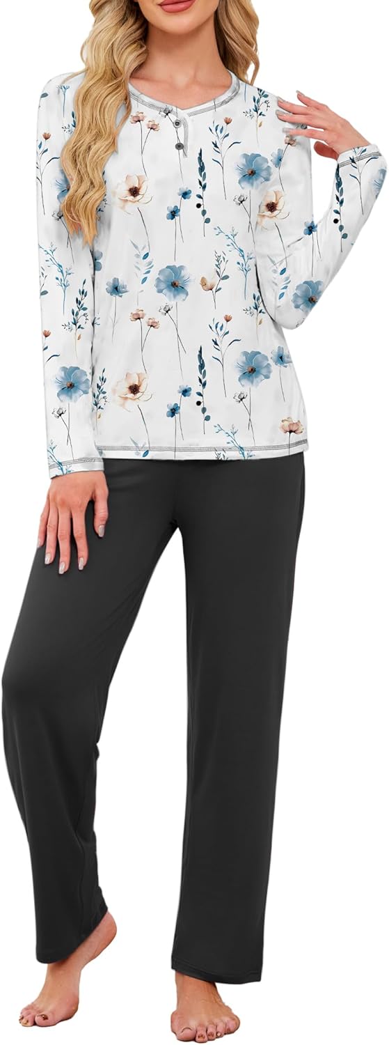 iChunhua Fall Pajamas for Women Set 2 Piece Loose Sleepwear Long Sleeve Henley Sleep Set Pjs Loungewear with Pocket