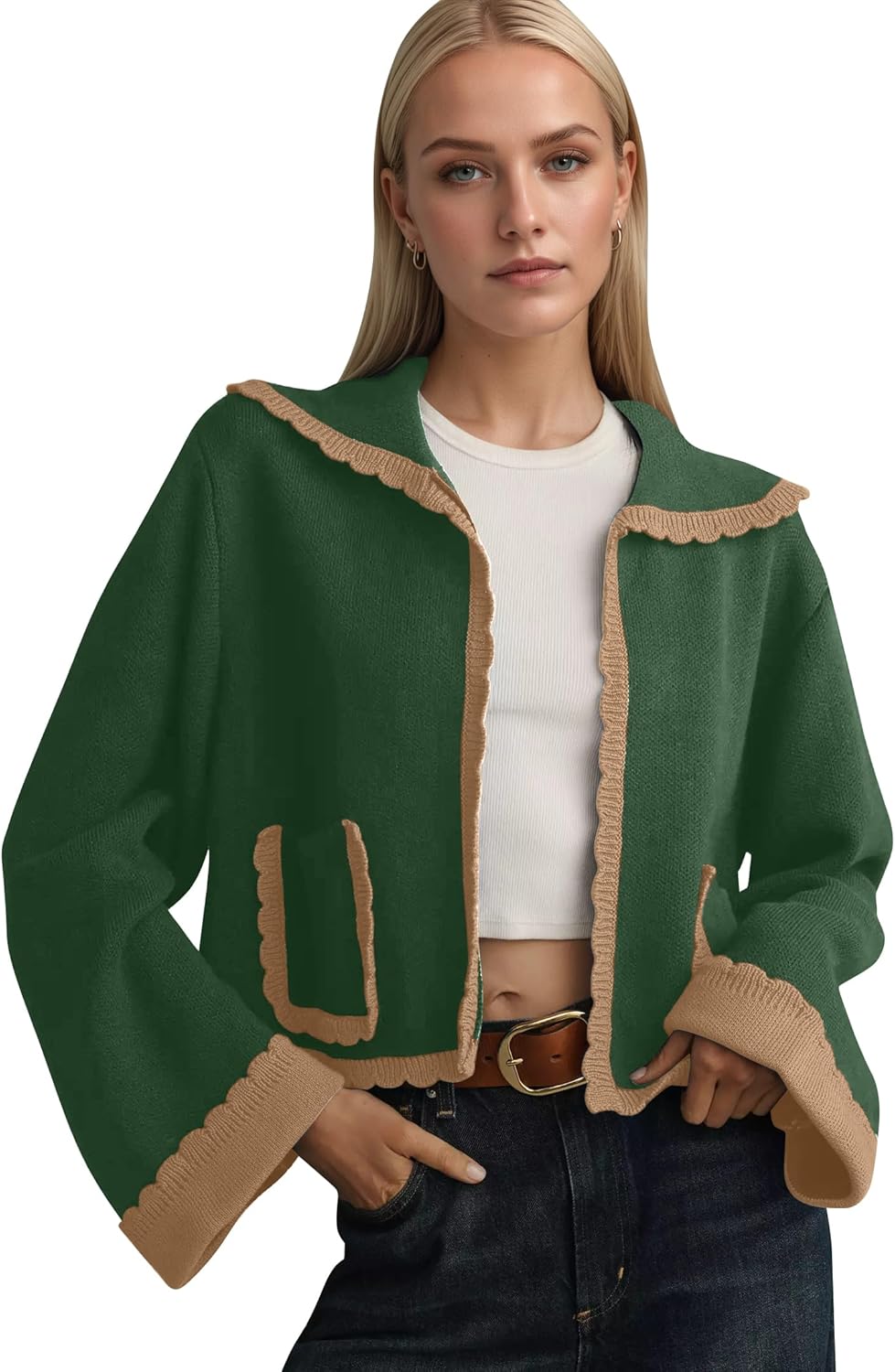 Ythomm Womens Scallop Lapel Collar Knit Cardigan Sweaters Color Block Long Bell Sleeve Open Front Fall Sweaters with Pockets
