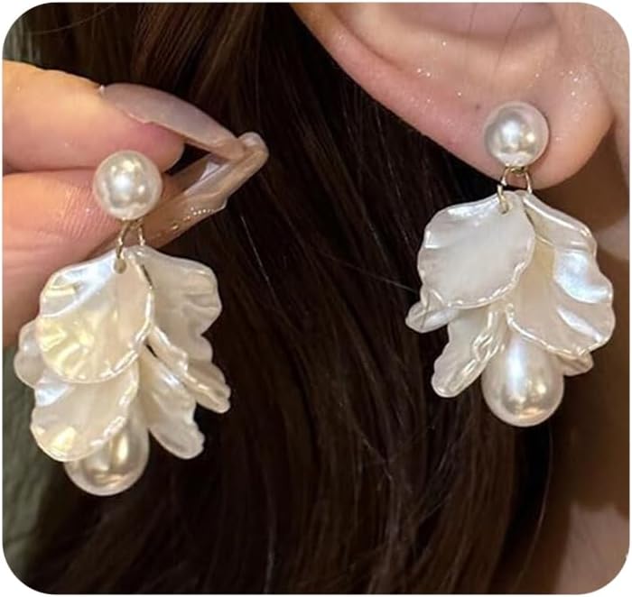 White Flower Dangle Earrings for Women,Gracefule Long Pearl Drop Earrings, Trendy Gold Dangling Earring,Dainty Petal Earring Brides Floral Jewelry