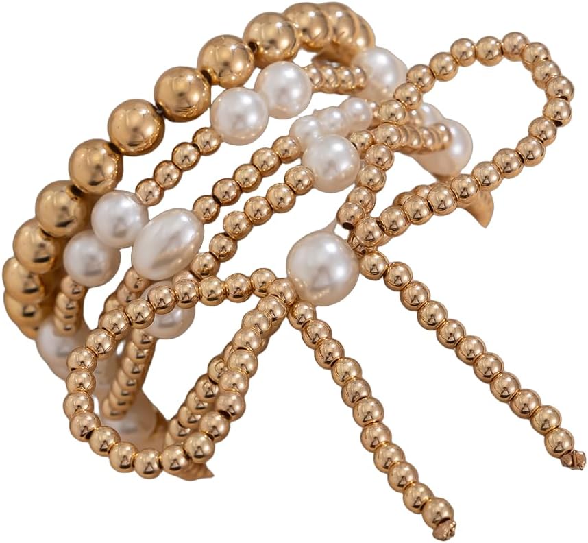 COLORFUL BLING Bow Gold Beaded Bracelets Layered Pearl Stretch Bracelets Set for Women Heart Simulated Pearl Stackable Elastic Bracelets Chunky Bowknot Adjustable Multilayer Bangles Wedding Jewelry