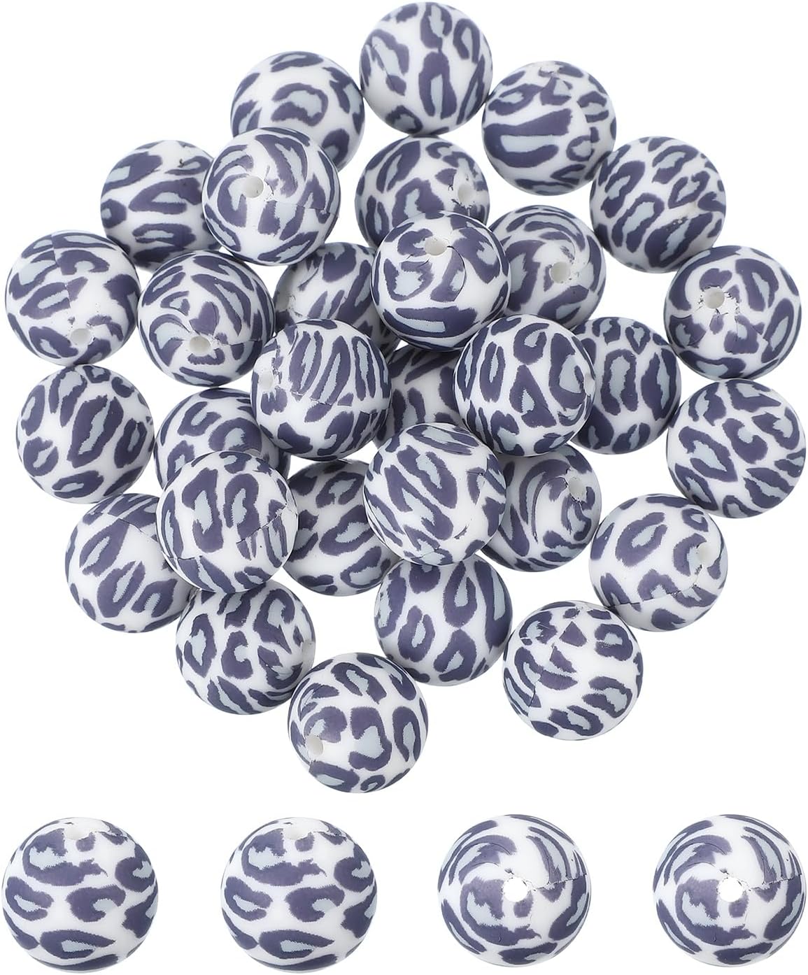 PATIKIL 30 Pcs Silicone Beads, 15mm Round Leopard Beads Bulk Cow Print Focal Bead for Beaded Pen Keychain Making Crafts Bracelets Beadable Jewelry Making Halloween, Snow Leopard