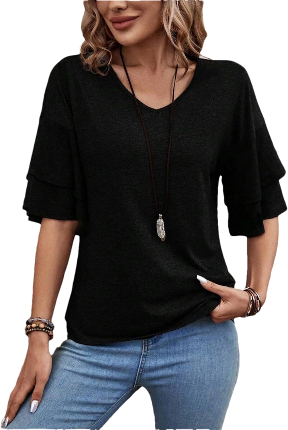 Womens V Neck Loose Fit T Shirt Double Layer Flounce Short Sleeve Top