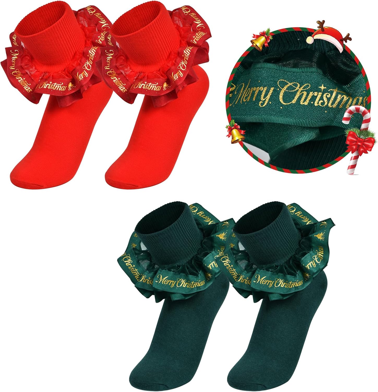 Women Ruffle Ankle Sock Adult Double Lace Turn Cuff Cotton Frilly Dress Cute Dwarf Xmas Sock with Merry Christmas
