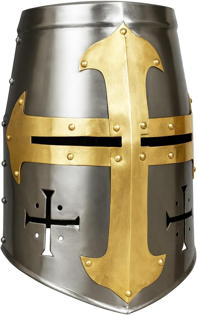 Medieval Crusader Great Helm – 18 Gauge Steel Knight Helmet with Brass Cross – Full Head Armor for LARP, SCA, Reenactment & Cosplay – Historical Templar Helmet