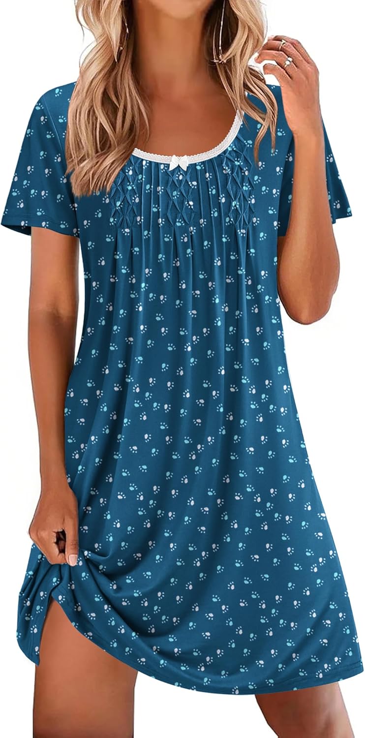 Ekouaer Nightgowns for Women Pleated Sleep Shirts Short Sleeve Night Shirts Lace Trim Night Gown Ladies Sleep Dress