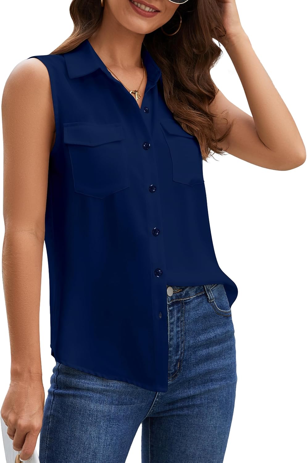 YAMANMAN Women's Sleeveless Button Down Shirts Blouses Solid Casual Tank Top Loose V Neck Summer Top for Work