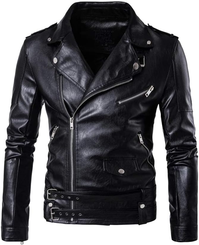 PASOK Men's PU Leather Jacket Causal Belted Faux Leather Motorcycle Jacket Zipper Biker Coat