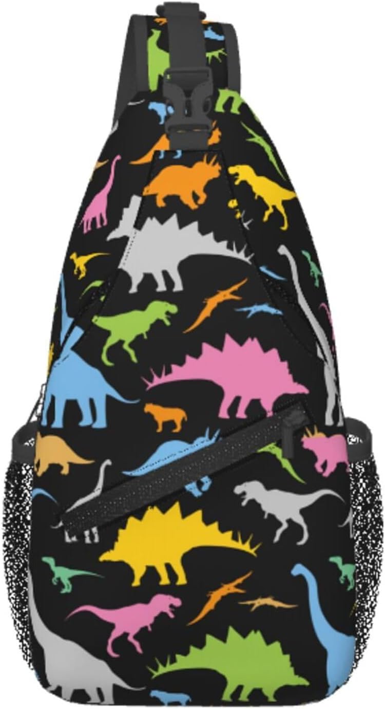 - 【LIGHTWEIGHT SLING BACKPACK】 Our cute dinosaur sling bag with standard size 3.5” x 7.5” x 15.3” is large enough to hold your daily supplies such as cellphone, purse, keys, cash, id wallets, sunglasses, tissues,etc.; With zippered pockets and patch inside pocket, it’s more convenient to take your commonly used items and don't need to worry about losing items.