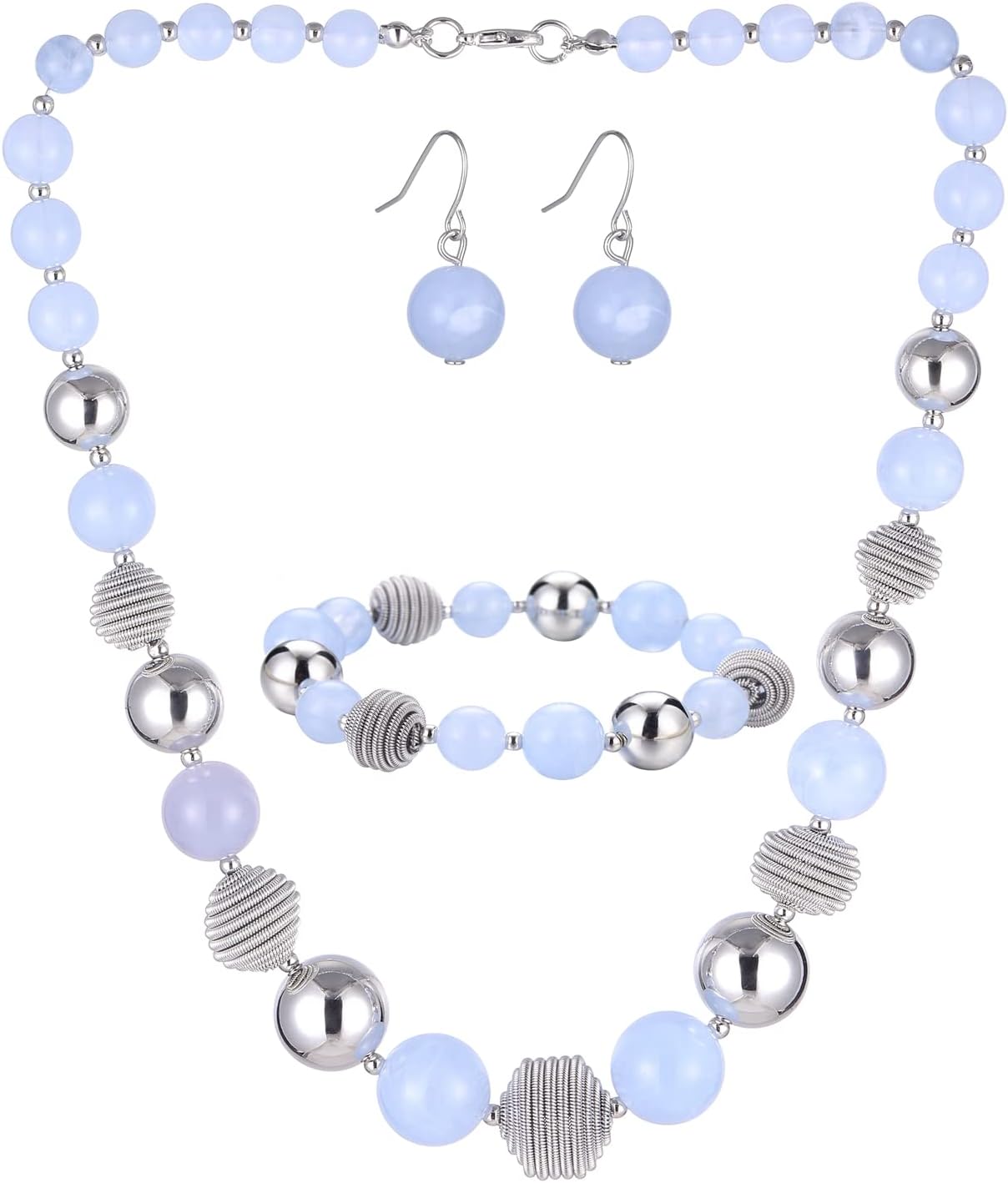 PEARL&CLUB Beaded Chunky Statement Necklace Earring and Bracelet Set Silver Metal Bead Fashion Jewelry Set Mothers’ Day Gifts for Women