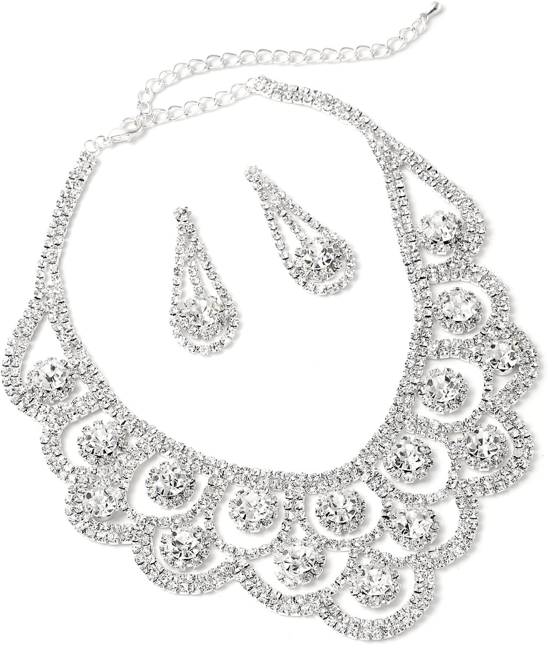 Topwholesalejewel Silver Crystal Rhinestone Bridal Wedding Party Teardrop Dangle Earrings Silver Crystal Dazzled Chandelier Necklace Jewelry Set