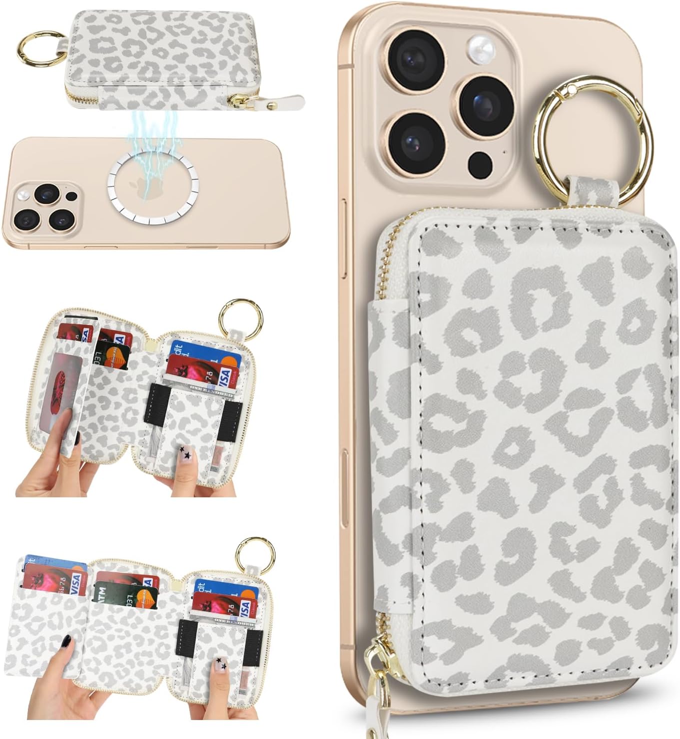 Compatible with MagSafe Wallet,Magnetic Phone Wallet Card Holder for iPhone 17/16 Pro Max/15 plus/14 Pro/13/12 Series,PU Leather Zipper Pocket Adjustable Stand-White Leopard