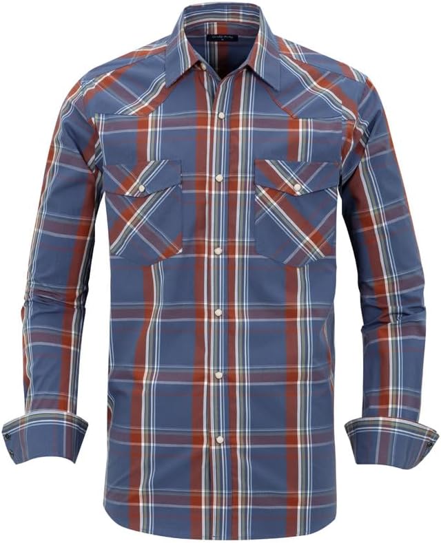 Men’s Western Cowboy Shirts-Long Sleeve Snap Button Plaid Shirt, Regular Fit Cotton Casual Shirt