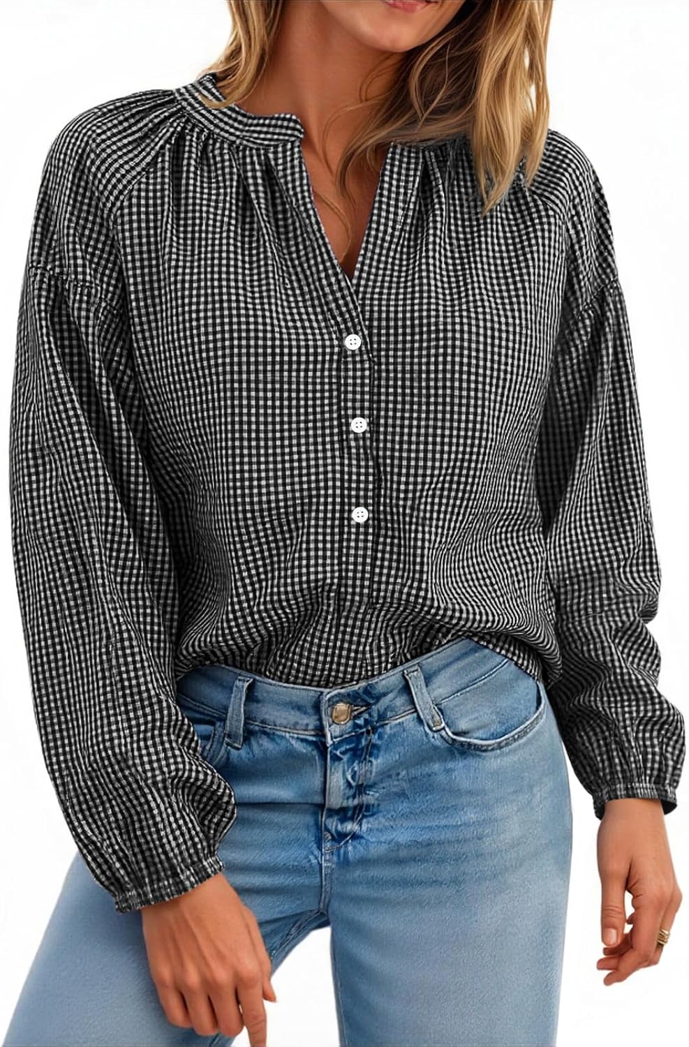 Cicy Bell Womens Puff Long Sleeve Blouse Gingham Pleated V Neck Button Down Shirts Loose Fit Dressy Casual Fall Tops
