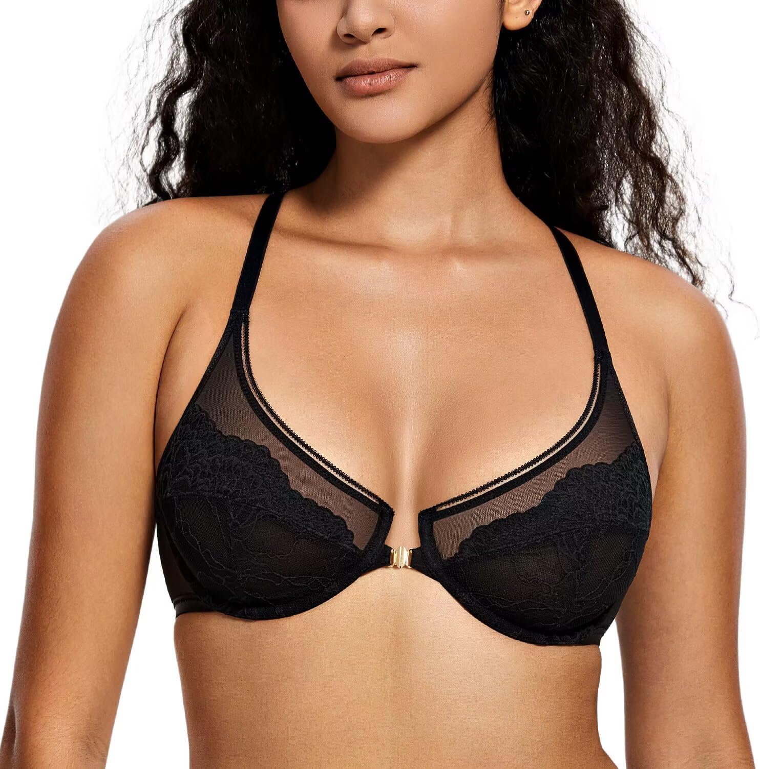 Deyllo Women's Lace Front Closure Bra Semi-Sheer Underwire Unlined Racerback Bra for Everyday