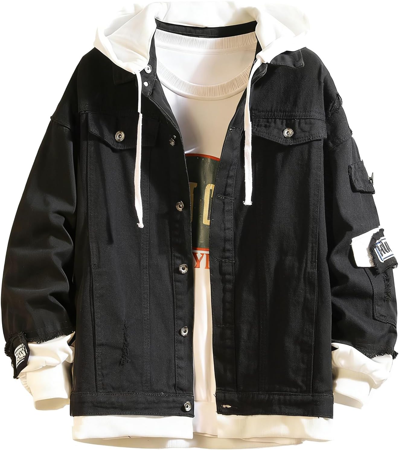 Unisex Denim Jacket with Hoodie Distressed Ripped Oversized Button Down Trucker Jean Jackets Coat