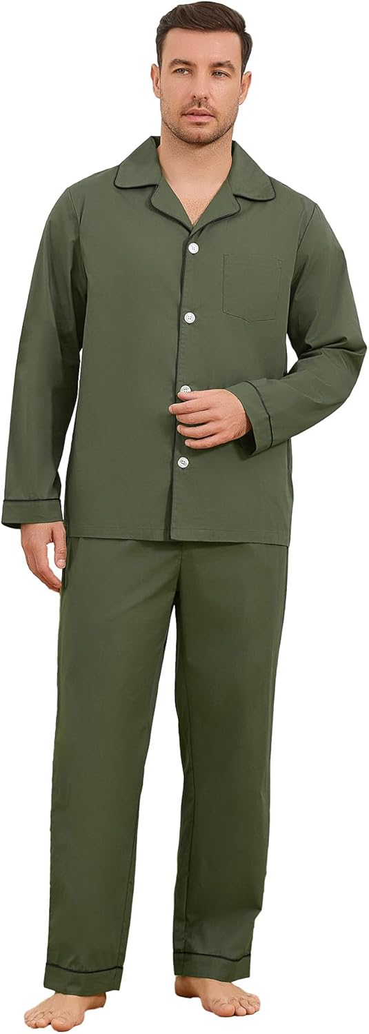 Vulcanodon Mens 100% Cotton Pajamas Set, Soft Long Sleeve Pajamas for men Lightweight Button Up Sleepwear Loungewear Pjs Set with Pockets(Army Green,M)