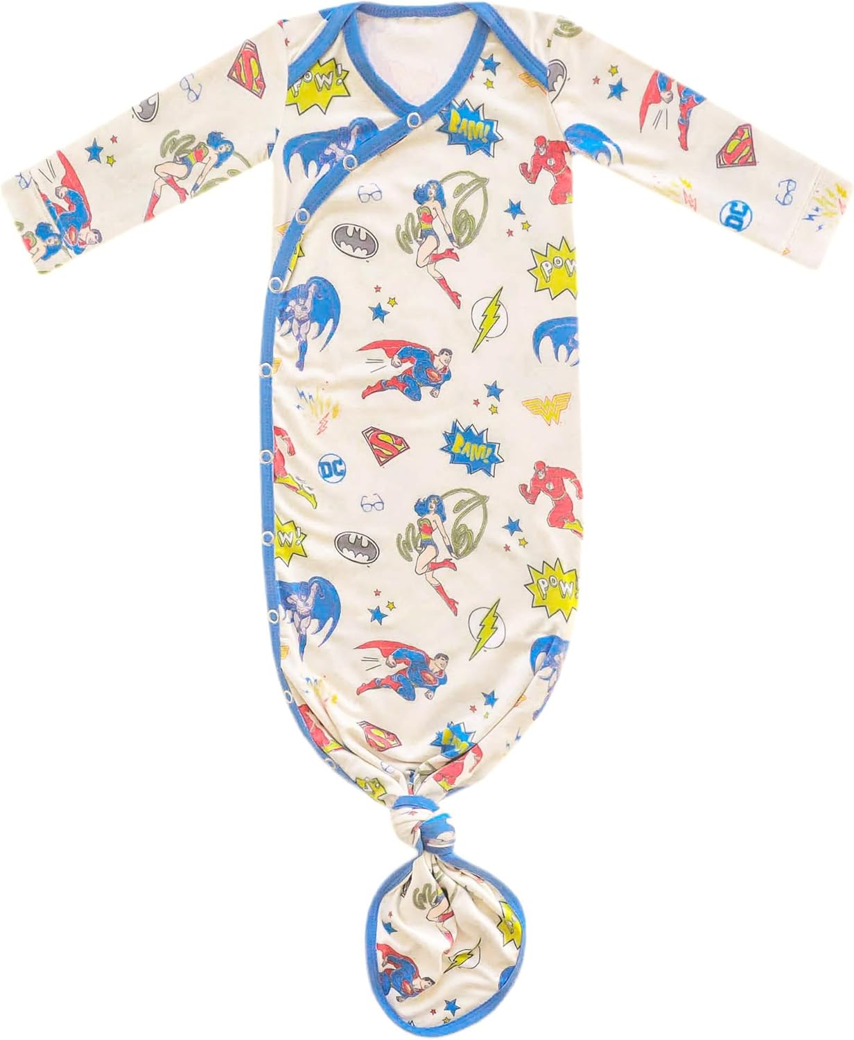 Copper Pearl Baby Gown - Knotted Newborn Sleepers for Baby Boy and Girl, Soft Stretchy Long Sleeve Infant Gowns with Bottom Tie and Hand Mittens, Perfect Hospital Coming Home Outfit (Justice League)