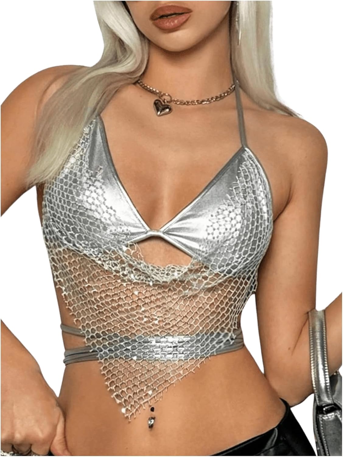MakeMeChic Women's Glitter Sequin Fishnet Halter Tops Y2K Criss Cross Tie Back Crop Party Club Festival Rave Top
