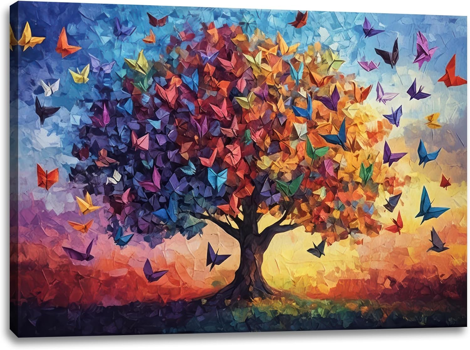 - 【Buterfly Tree Wall Art】This origami butterfly tree of life wall art 12x16 in(Stretched Canvas on A Wooden Frame), features a striking warm-cool color gradient (blue-purple + orange-yellow). It complements bright spaces with modern minimalist or light luxury aesthetics while also enlivening vintage or art-inspired interiors with darker furnishings,elevates the space's vibrancy and artistic flair.