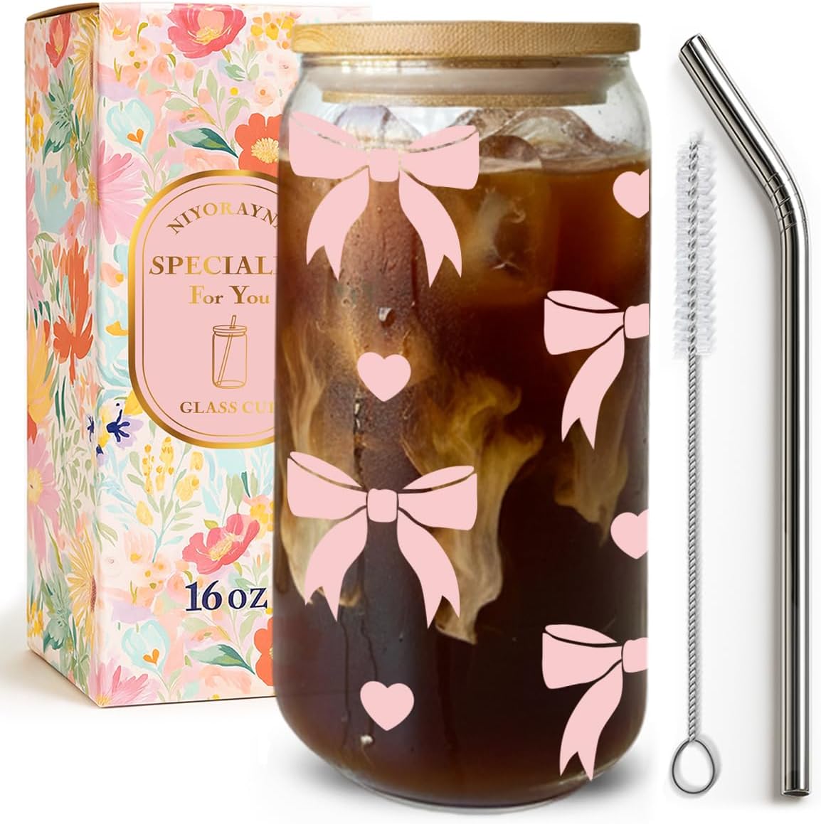 - 【Complete Gift-Ready Set】This 16 oz clear glass drinking jar includes a bamboo lid, reusable glass straw, cleaning brush, and gift box—ready for use or gifting. The spill-resistant lid makes it perfect for daily routines or special occasions.