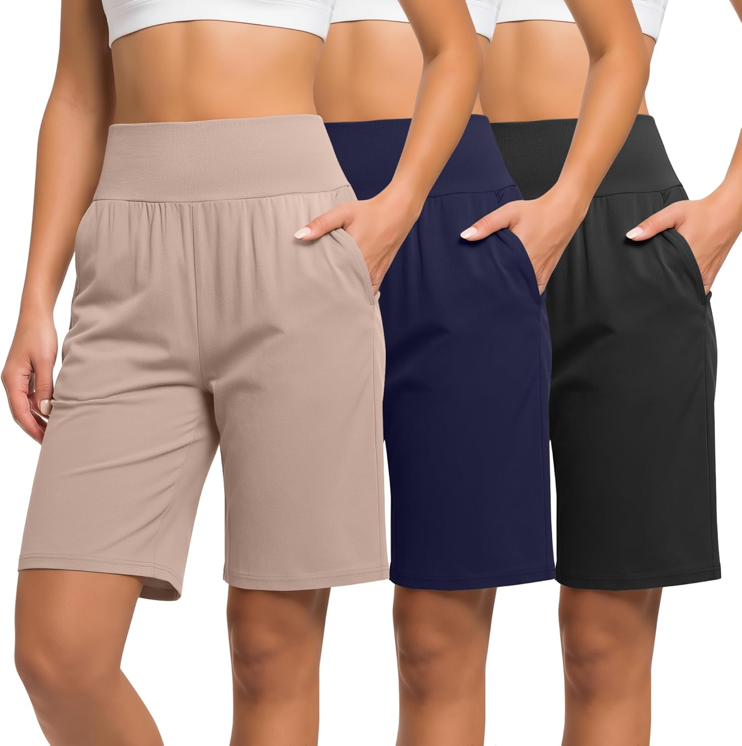 Neer 3 Pack Women's Bermuda Shorts, High Waist Basic Stretch Casual Bottoms Knee Length Summer Athletic Short with Pockets