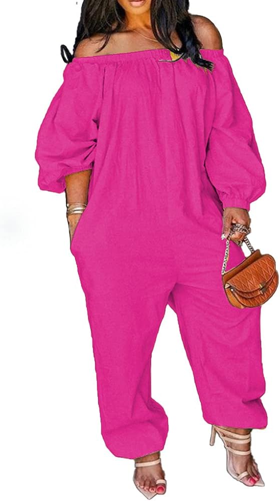 MESLIMA Women's Loose Fit Elastic Off Shoulder Beam Foot Long Sleeve Jumpsuit Rompers with Pockets Plus Size