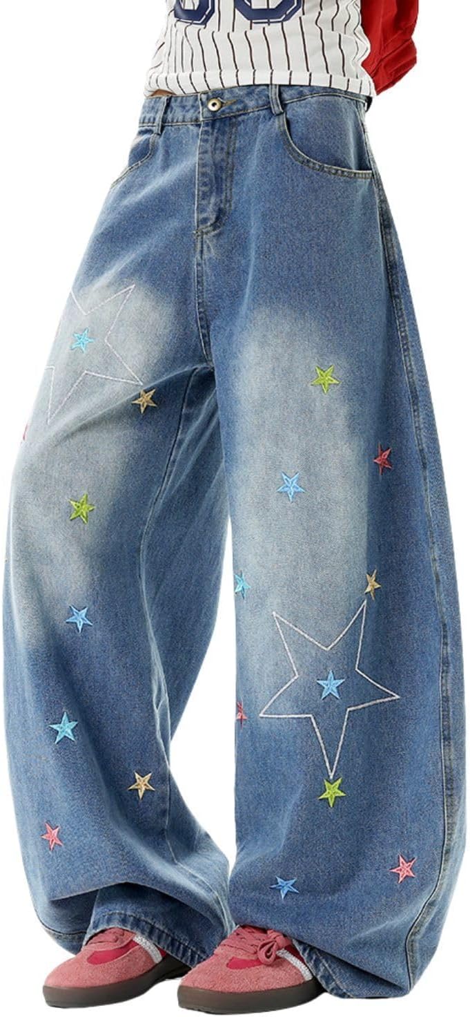 Baggy Jeans for Women Girls Star Embroidered High Waist Barrel Leg Jean Casual Cute Pants Preppy Clothes