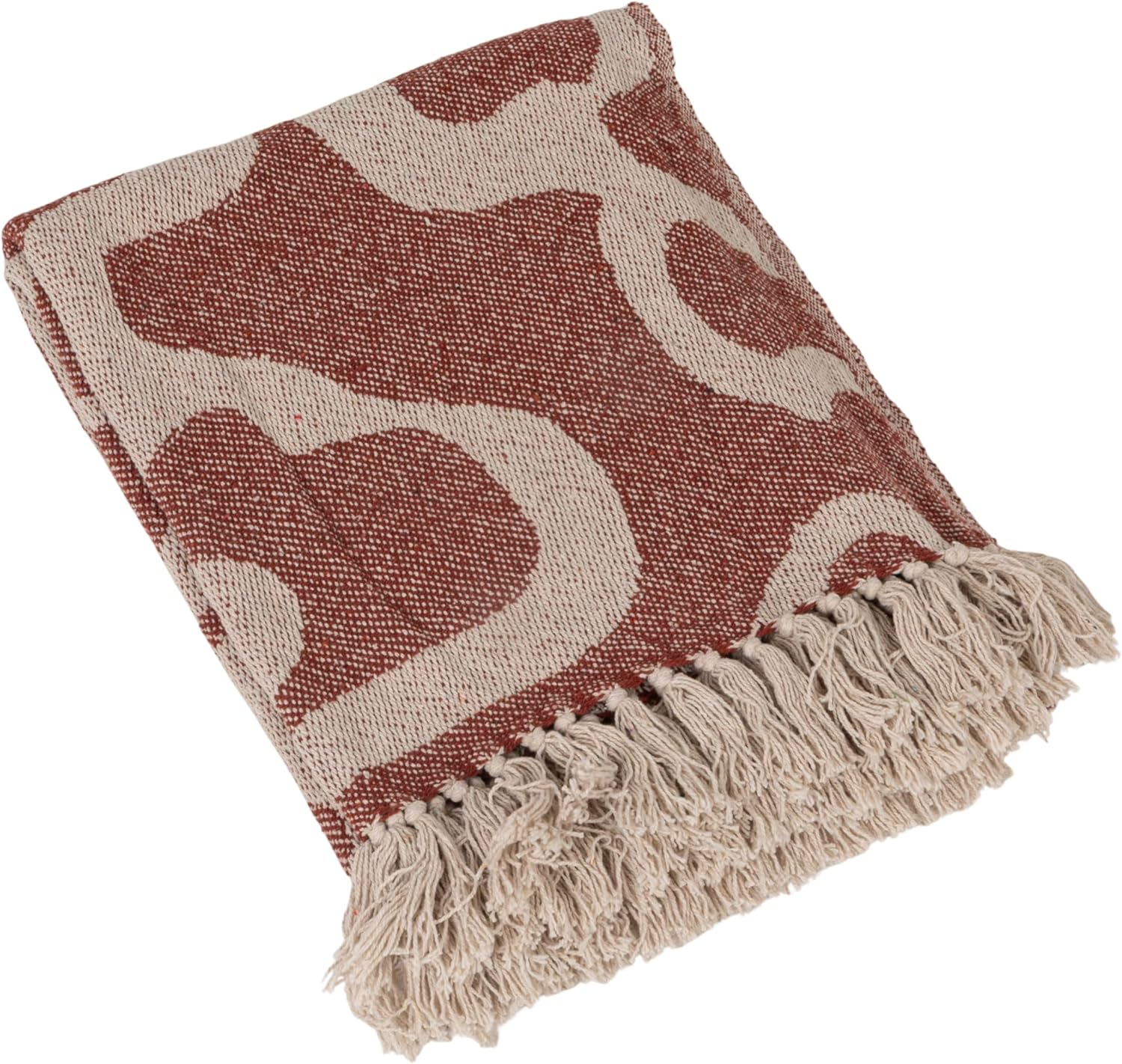 - A 60-inch long and 50-inch wide woven cotton blend jacquard throw, featuring an abstract pattern in natural and brown tones, accented with fringe for a soft, textured finish