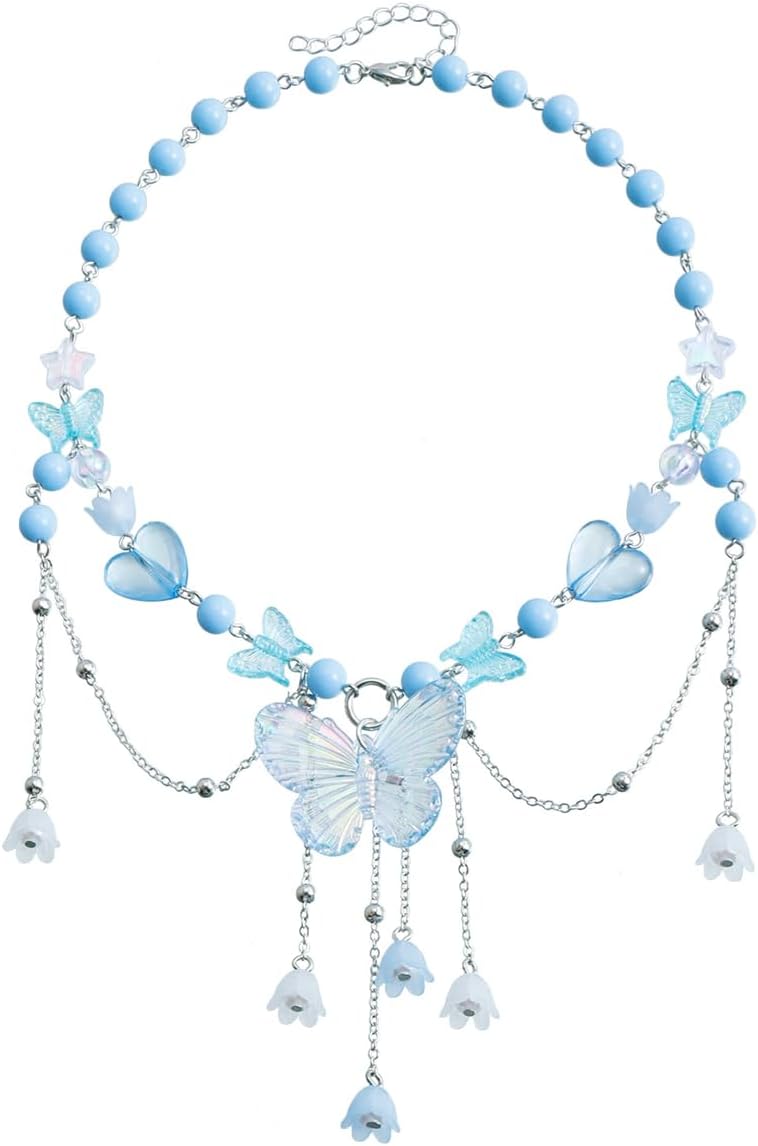 Layered Pearl Butterfly Choker Necklaces for Women,Vintage Crystal Beaded Pendant Necklace Y2K Bow Heart Tassel Chain Necklace Jewelry