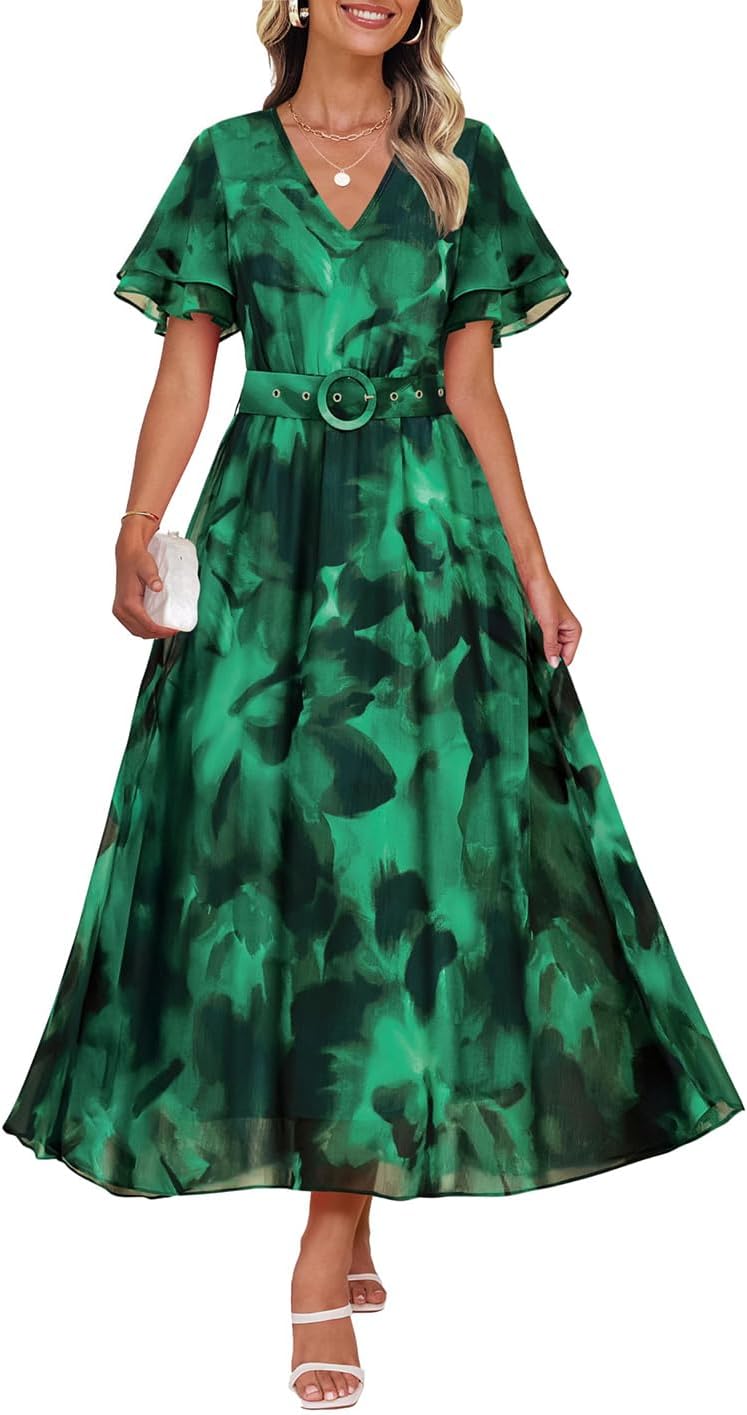 ZESICA Women's 2026 Summer Floral V Neck Midi Dress Boho Short Sleeve High Waist Flowy Beach Vacation Dresses with Belt