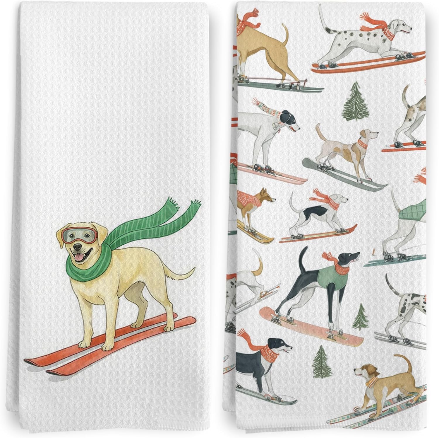 Winter Ski Labrador Retriever Kitchen Towels, Yellow Lab Gifts for Women Dish Tea Towels for Kitchen, Ski Lover Gifts Decorative Hand Towels, Winter Dog Bathroom Decor, 16x24 Inch Set of 2